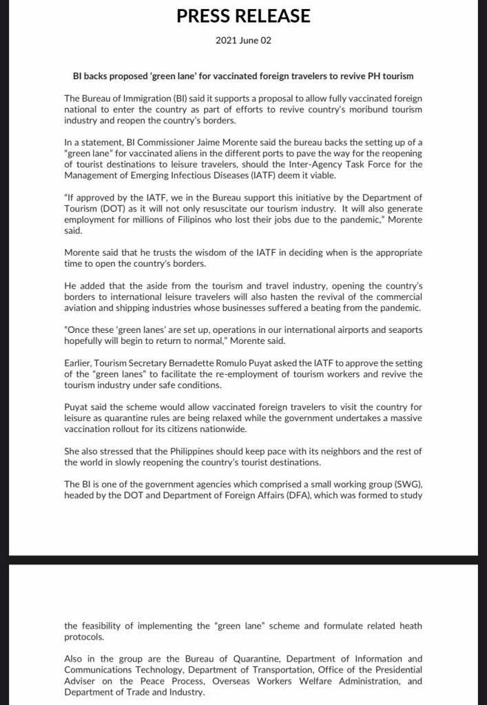 The Bureau of Immigration (BI) said it supports a proposal to allow fully vaccinated foreign national to enter the country as part of efforts to revive country’s moribund tourism industry and reopen the country’s border.